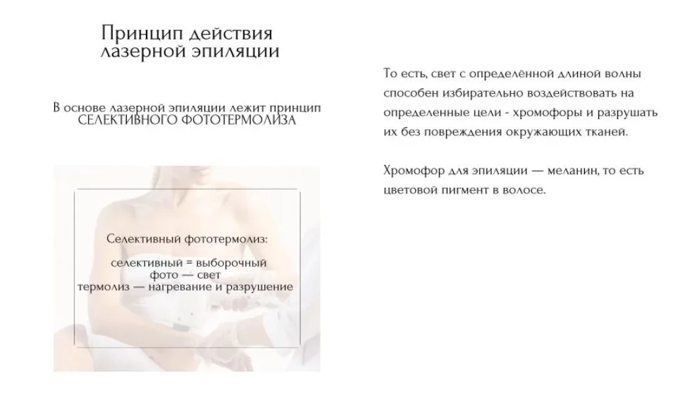 Adică, lumina cu o anumită lungime de undă poate acționa selectiv asupra unor ținte specifice - cromofori și le poate distruge fără a deteriora țesuturile înconjurătoare. Cromoforul pentru epilare este melanina, adică pigmentul de culoare din păr.